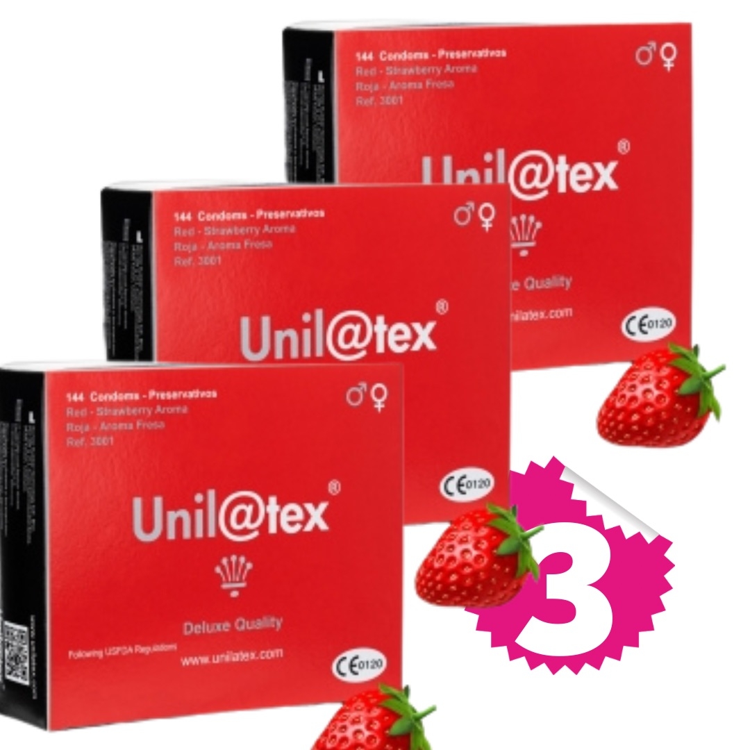 3 Cajas de 144 preservativos fresa. Total 432 preservativos al mejor precio. Los preservativos UNILATEX son elaborados mediante la combinación del mejor látex del planeta, junto con la última tecnología alemana de vanguardia Certificados por Certificación Europea: CE 1639.