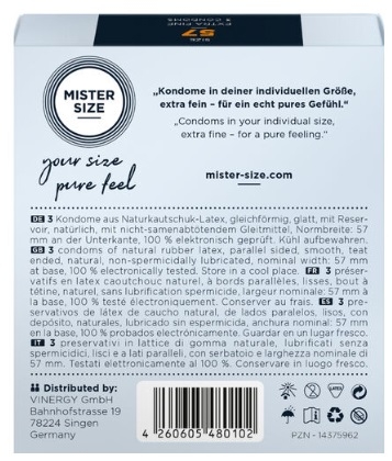 A veces, lo estándar no es suficiente. Al colocarte el condón, probablemente ya hayas experimentado la molestia de que no te quede tan ajustado. No es de extrañar que aún no hayas encontrado tu talla personal. Pero a partir de ahora siempre podrás llevar contigo MISTER SIZE 57. Ahora que la química es la adecuada, podrás experimentar lo ligero que puede ser el sexo.