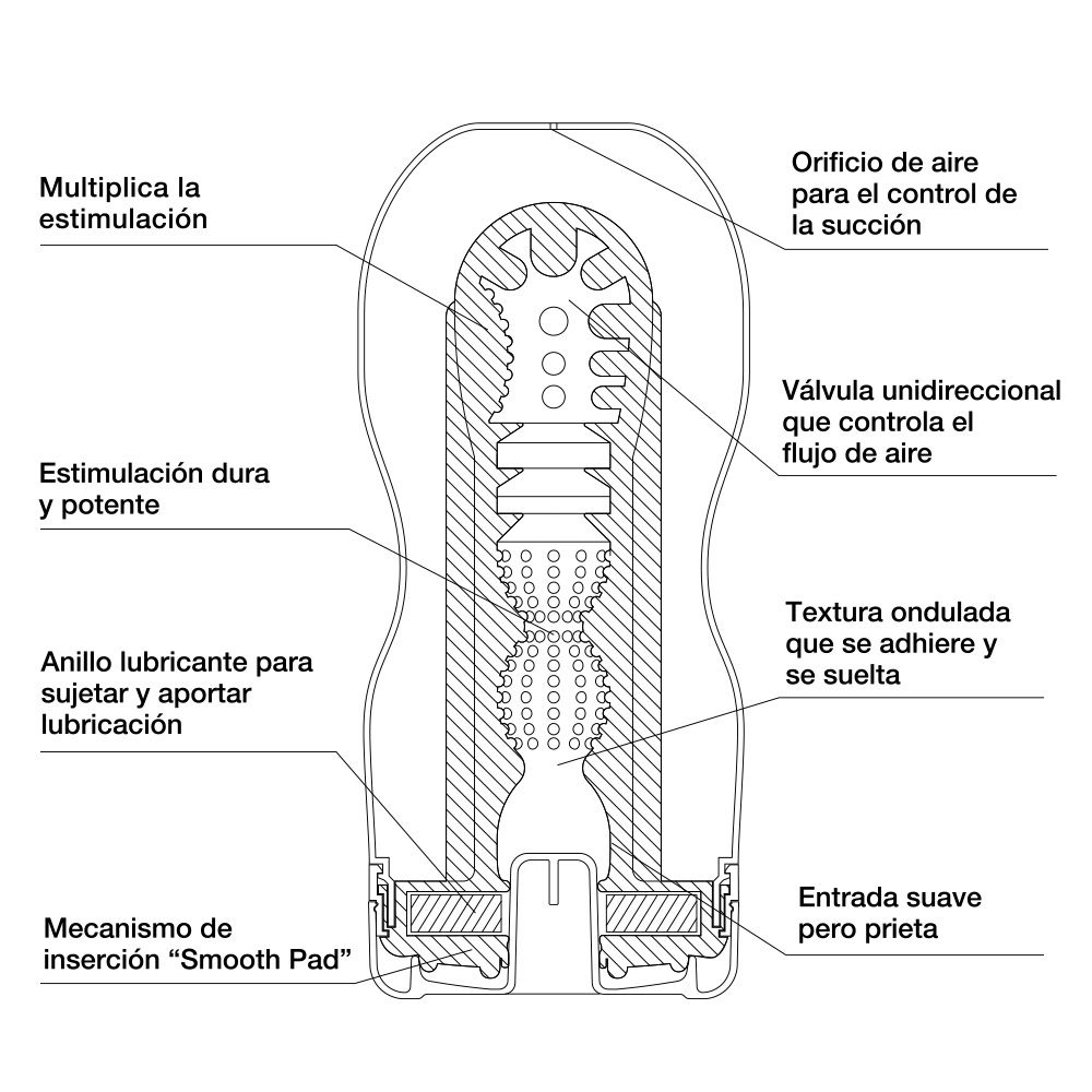 Con válvula de vacío (pegatina) que regula la succión, produce una experiencia similar a la de una felación. En su interior se esconden una serie de pliegues y estrecheces que imitan a una cavidad bucal con precisión.